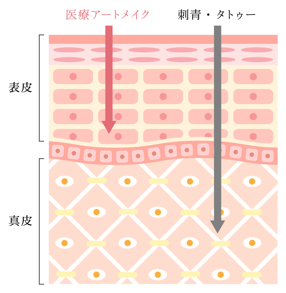 医療アートメイクは医師の管理のもと、アートメイク専用の針を使い、皮膚の表皮部分に色素を入れて、肌を染色する施術です。半永久的に取れない刺青・タトゥーとは異なり、皮膚のターンオーバー(新陳代謝)によって少しずつ薄くなっていきます。色の定着には個人差がありますが、最低でも2回以上の施術をオススメしております。
